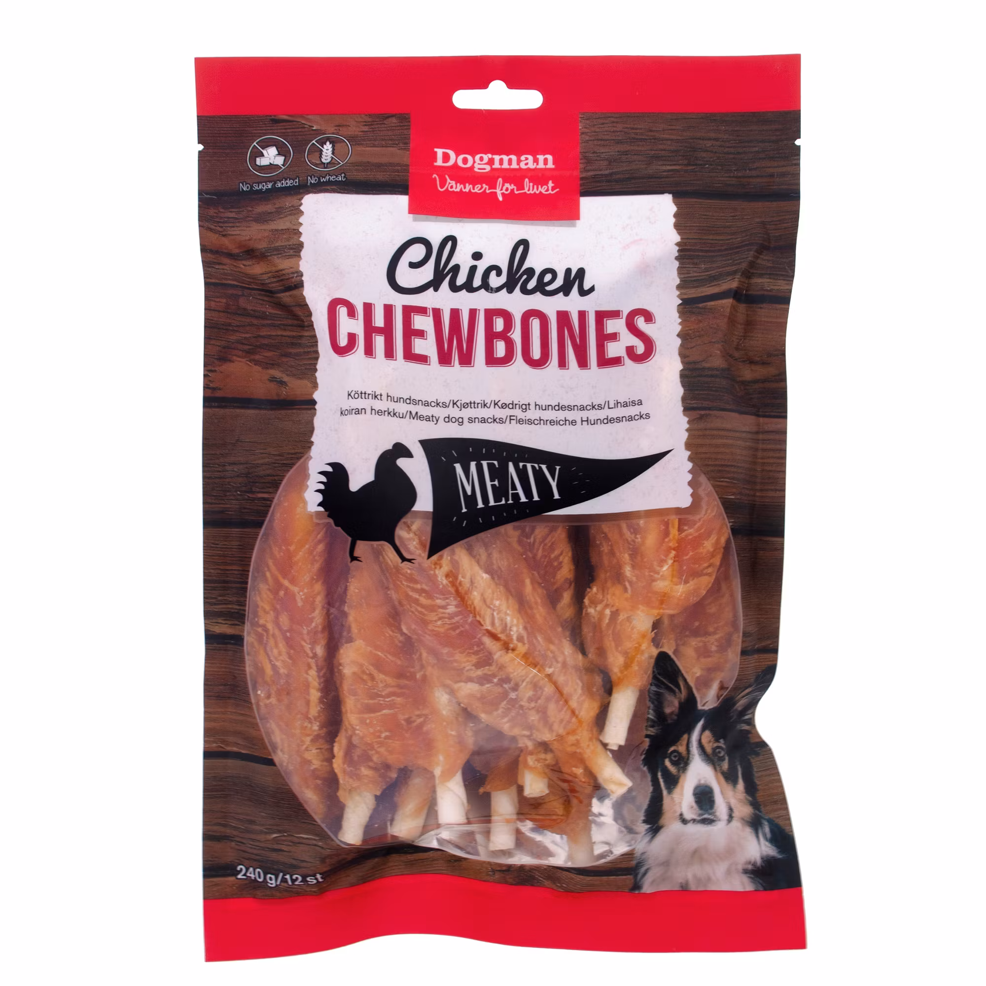 Smaskiga tuggpinnar av råhud inbäddade i delikat kyckling. Oemotståndlig smak! Ges som belöning vid sidan av en balanserad kost. Håll alltid din hund under uppsikt när den ges tuggben. Med Grade A-kyckling. Chicken chewbones