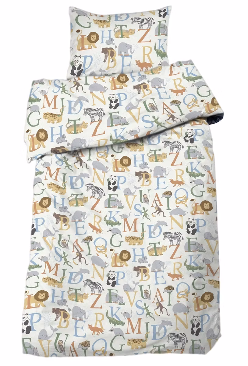 Det ljusa vita bäddsetet är dekorerat med färgglada illustrationer där varje bokstav paras ihop med ett djur – som apor, delfiner, elefanter, igelkottar, pandor, zebror, ödlor och många fler. Den lekfulla designen stimulerar barnets fantasi och gör sängen till en trygg och rolig plats. Mönstret är tydligt men harmoniskt, vilket passar perfekt i barnrum med både färg och lugn.
