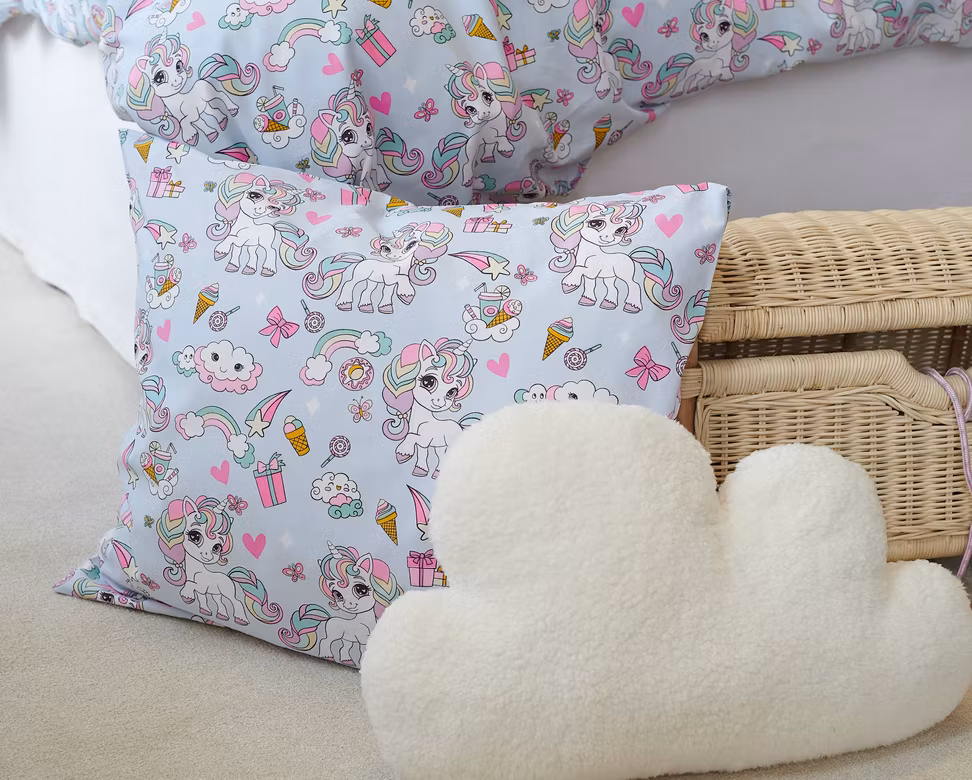 Det charmiga mönstret av enhörningar, regnbågar och glassar på blå botten skapar ett glatt och harmoniskt sovrum, medan den mjuka bomullen gör nattsömnen extra skön.