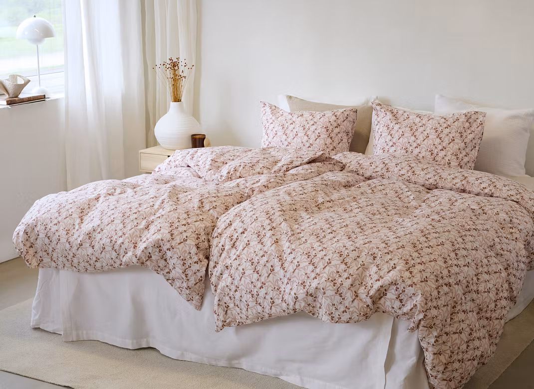 Detta eleganta påslakanset kombinerar romantiska, botaniska motiv i mjuka nyanser av beige och rosa, vilket ger rummet en naturlig, varm och tidlös karaktär.
