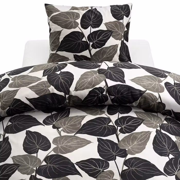 Detta vackra bäddset har ett naturinspirerat mönster av stora, slingrande blad i varma bruna toner, som skapar en känsla av att befinna sig i skogens stilla harmoni.