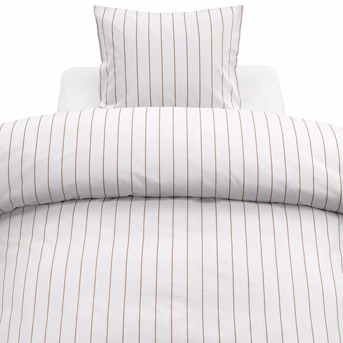 Detta stilrena bäddset har ett klassiskt mönster med smala, lodräta ränder i en vacker rostfärg mot vit botten, vilket skapar en elegant kontrast som lyfter hela rummet.