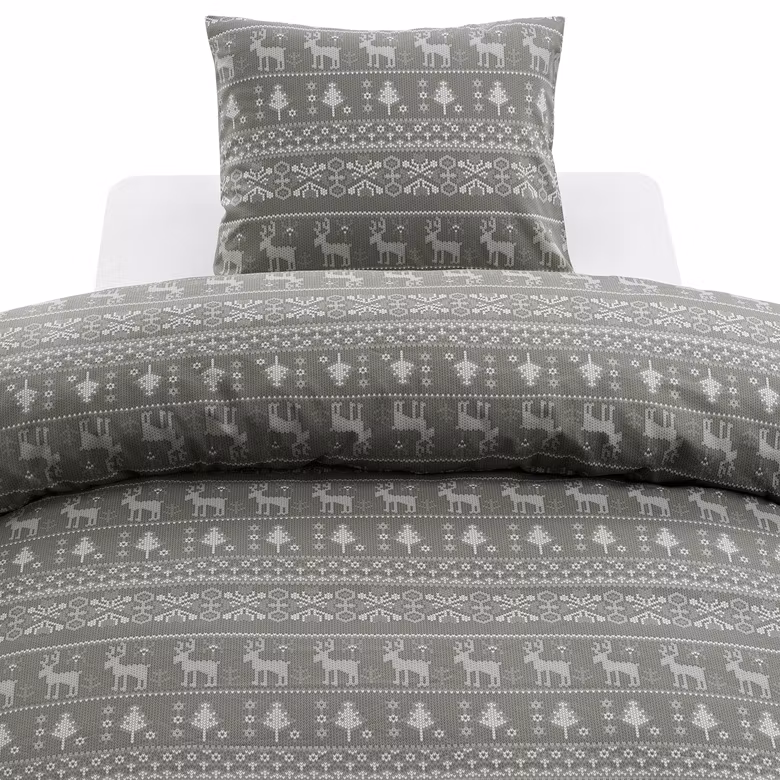 De fina motiven av renar, granar och dekorativa ränder skapar en klassisk men diskret julkänsla – perfekt för sovrummet, gästrummet eller fjällstugan.