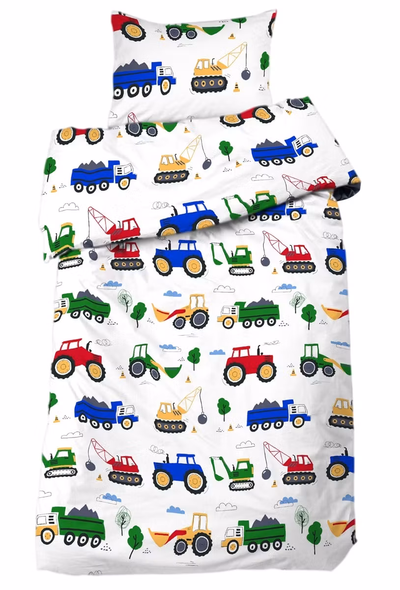 Ge barnrummet en rolig och livfull känsla med Busy Tractors bäddset från Redlunds. Detta bäddset är skapat för alla små som älskar traktorer och stora maskiner. Med sitt häftiga mönster av traktorer i rött, blått, gult och grönt mot en klassisk vit botten blir sängen en härlig mittpunkt i rummet. Här får barnen drömma sig bort bland maskiner och äventyr – varje natt.