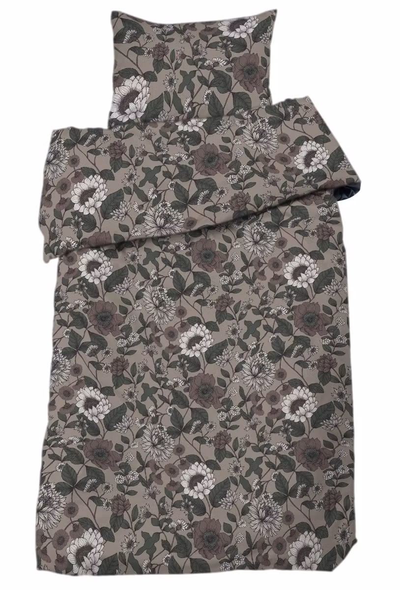 Dahlia har ett romantiskt och naturnära blommönster skapat av svensk designer. Kombinationen av linne- och gröna toner tillsammans med blomsterdetaljerna ger ett lugnt men samtidigt livfullt intryck som passar både moderna och klassiska sovrum.