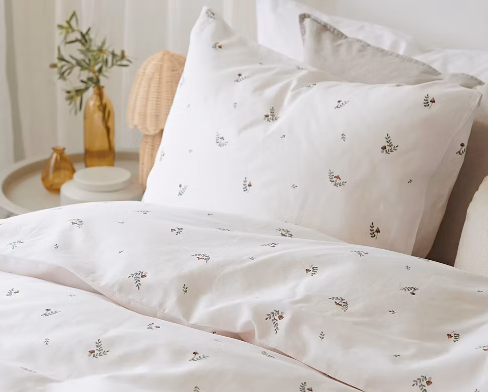 Det romantiska blommönstret är elegant utformat för att ge liv åt sängen utan att ta över rummet. Persikatonen tillför värme och mjukhet och gör bäddsetet lätt att kombinera med både ljusa och naturinspirerade inredningsdetaljer. Resultatet är ett sovrum som känns rofyllt, harmoniskt och personligt.