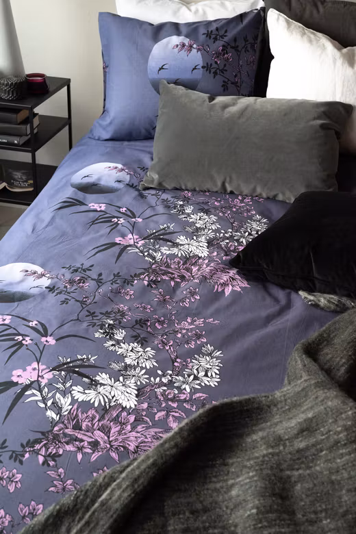 Skapa en drömlik och rogivande stämning i sovrummet med Japan Grå bäddset från Borganäs of Sweden. Mönstret är inspirerat av Japans vackra natur, med detaljerade japanska blommor i vitt och lilarosa och en drömlik måne i bakgrunden. Den grå bottenfärgen med lila undertoner ger en mjuk och elegant känsla som passar perfekt för dig som vill ha ett mer harmoniskt och estetiskt uttryck i ditt sovrum.