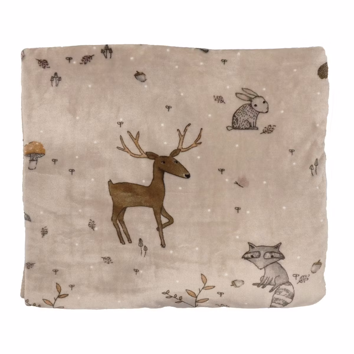 Denna mjuka och härliga pläd har en beige bottenfärg som framhäver de söta kaninerna, tvättbjörnarna och hjortarna bland löv och svampar.