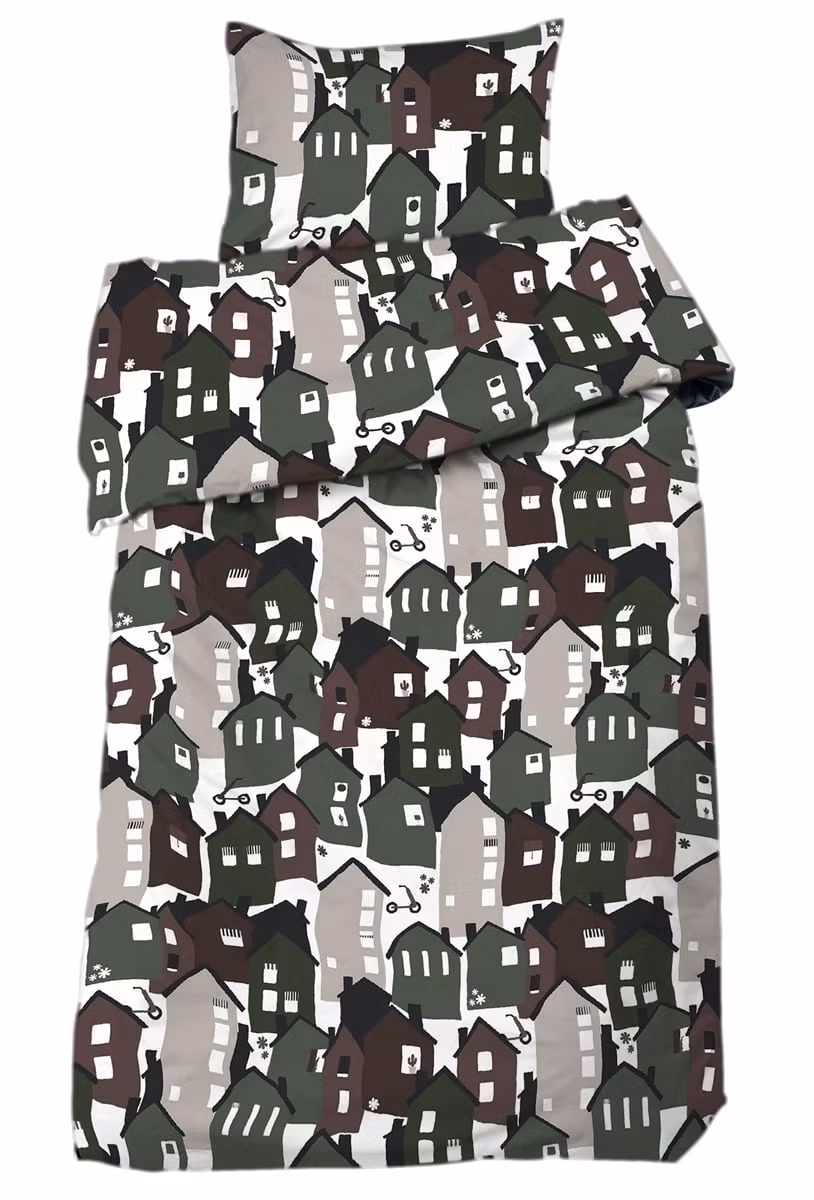 Village Grön bäddset från Redlunds är ett stilfullt och personligt bäddset som ger sovrummet liv och karaktär. Det dekorativa mönstret med små hus i harmoniska nyanser av grönt, grått och brunt skapar ett modernt men samtidigt varmt uttryck. Ett perfekt val för dig som vill ha ett bäddset som känns både mysigt och designmedvetet.